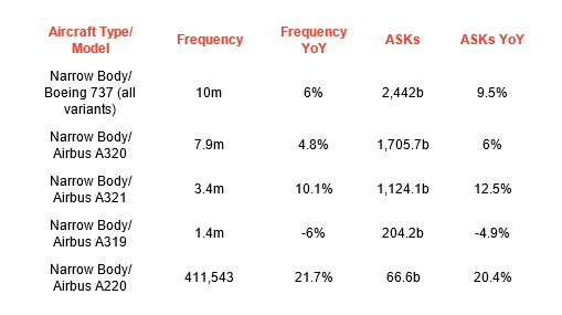 Boeing ve Airbus’ın dar gövdeli uçakları, 2024 yılında en çok kullanılan uçaklar arasında yer aldı. Boeing 737 (tüm versiyonları dahil), 2024 yılında 2,4 trilyon Mevcut Koltuk Kilometresi (ASK) ile 10 milyon uçuş gerçekleştirdi. Bunu, 7,9 milyon uçuş ve 1,7 trilyon ASK ile Airbus A320 ve 3,4 milyon uçuş ve 1,1 trilyon ASK ile Airbus A321 izledi.