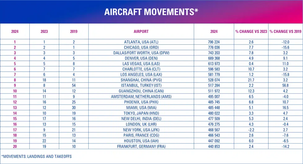 Uluslararası Havalimanları Konseyi (ACI) World, dünyanın en yoğun havalimanları son küresel sıralamayı açıkladı. Atlanta Hartsfield-Jackson bir kez daha 100 milyon barajını geçen tek havalimanı olurken, İstanbul Havalimanı yedinci sırada yer aldı.