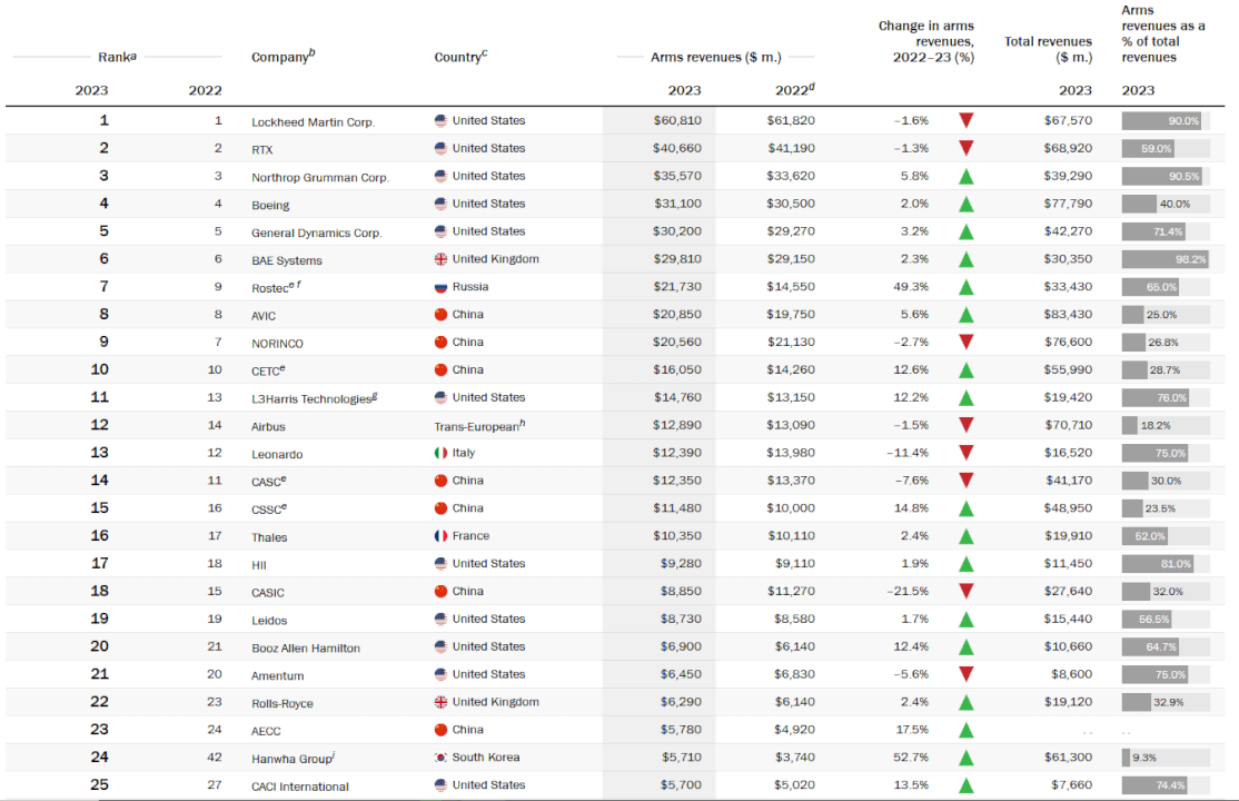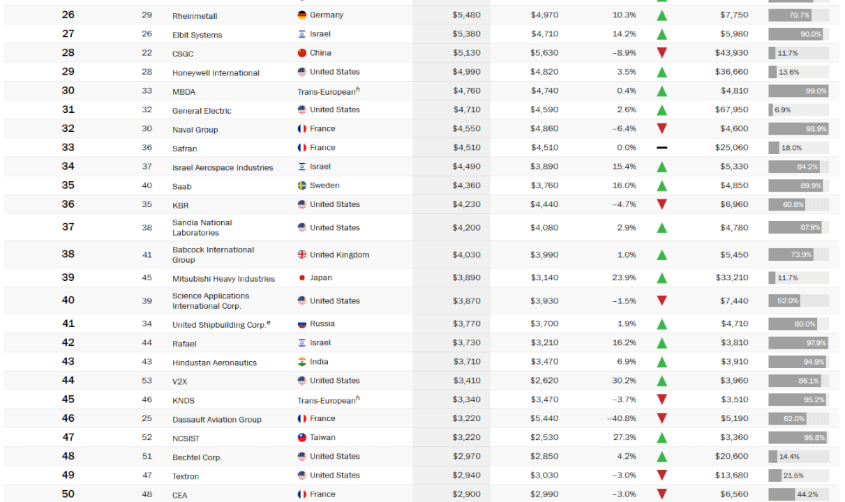 2018’den bu yana listenin başındaki 5 firmanın tamamının ABD merkezli olması dikkati çekti. Bu firmalar Lockheed Martin, RTX (eski adı Raytheon Techologies) Northrop Grumman, Boeing ve General Dynamics olarak sıralandı.