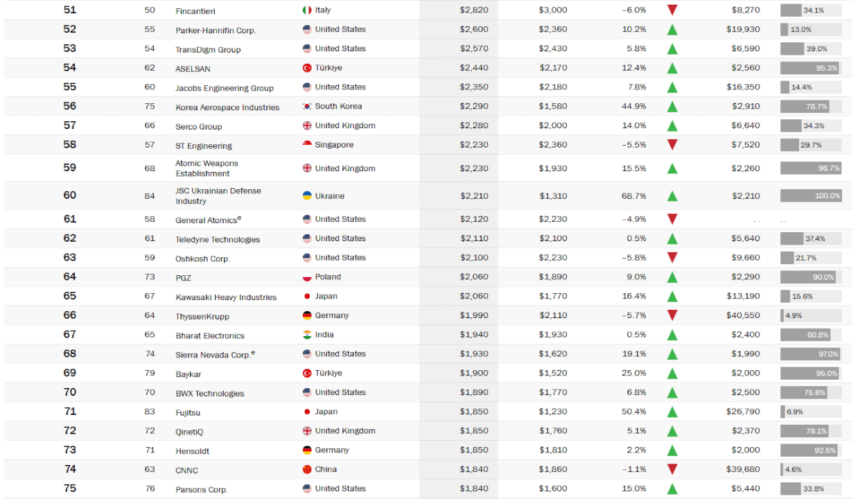 Stockholm Uluslararası Barış Araştırmaları Enstitüsünün (SIPRI), dünyanın ilk 100 savunma sanayisi şirketinin 2023 satışlarına ilişkin verileri yayınladı.