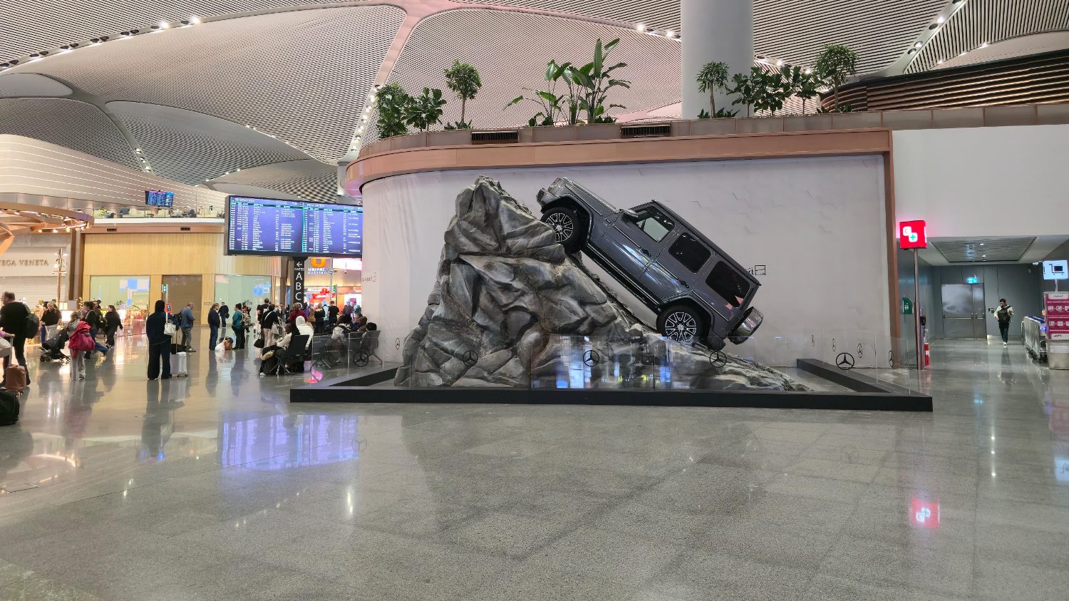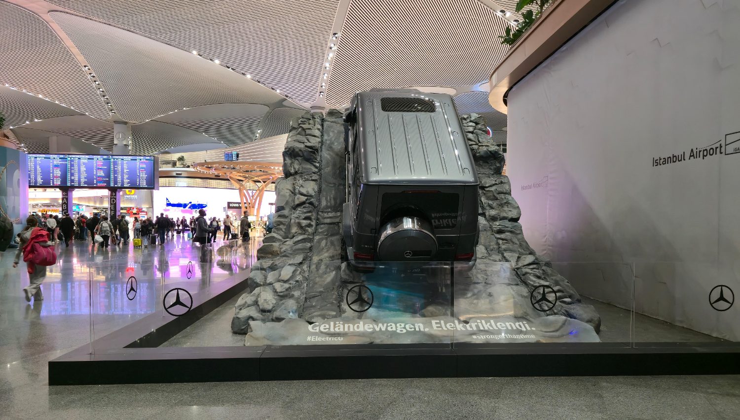 Bosphorus alışveriş alanında sergilenen Mercedes-Benz G 580, doğal kaya formu üzerinde konumlandırılarak markanın arazi gücünü ve elektrikli geleceğini bir araya getiriyor. Gerçek bir tırmanış hissi uyandıran bu dinamik kurgu, Mercedes-Benz’in yenilikçi ruhunu İGA İstanbul Havalimanı’nın modern mimarisiyle bütünleştiriyor.
