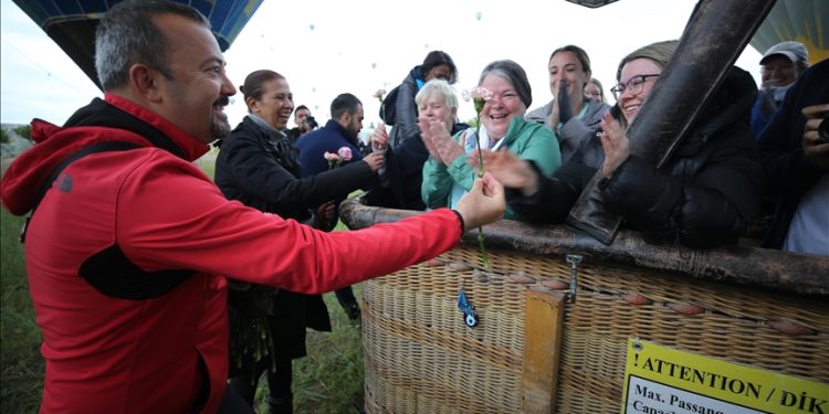 Turist rehberleri, tura katılarak Kapadokya’nın güzelliklerini gökyüzünden izlemeye hazırlanan yerli ve yabancı kadın turistlere çiçek takdim etti.