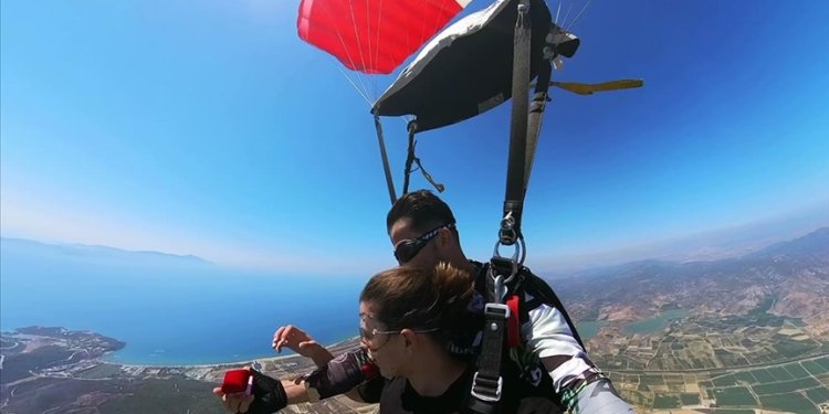 İzmir’in Selçuk ilçesinde serbest paraşüt eğitmeni Mehmet Karadaş, kız arkadaşı Aybike Aşkar’a paraşüt atlayışı sırasında evlilik teklif etti.