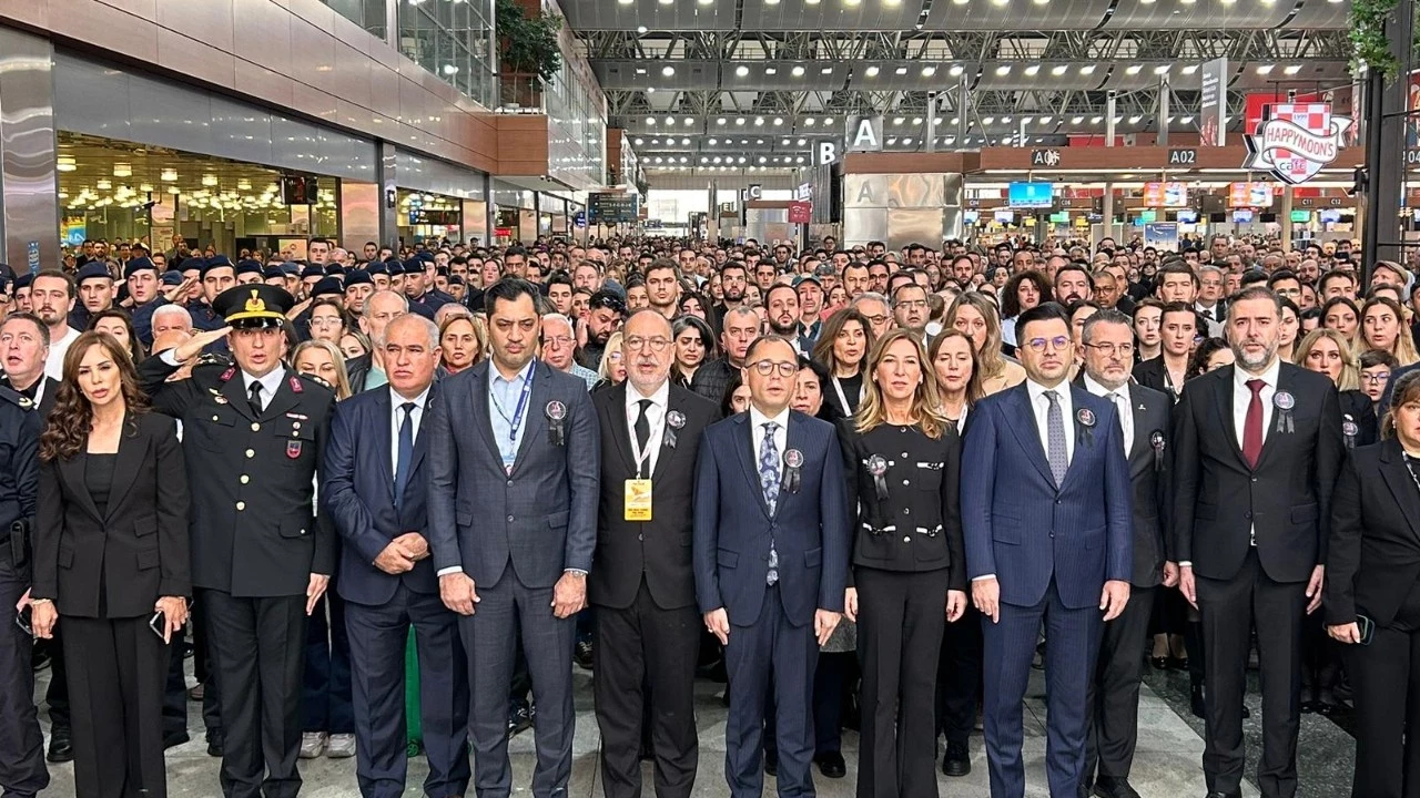 Saat 9’u 5 geçe sirenlerin çalmaya başlamasıyla Atatürk’e duyulan sevgi, saygı ve minnetin göstergesi olarak pasaport kontrolden check-in kontuarlarına tüm terminal genelinde Ulu Önder Mustafa Kemal Atatürk için saygı duruşunda bulunuldu, ardından İstiklal Marşı okundu.