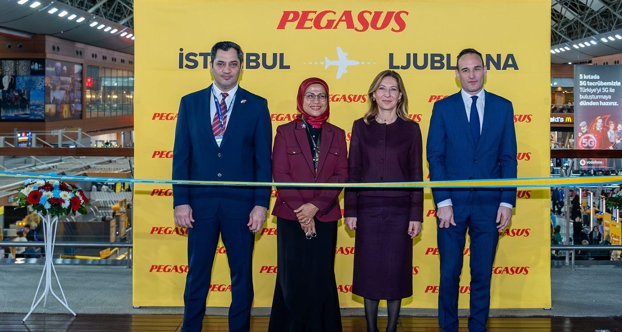 Pegasus Hava Yolları’nın, Sabiha Gökçen SAW – Ljubljana (LJU) hattının açılışı için düzenlenen törene Slovenya Büyükelçisi Gorazd Rencelj, Fahri Konsolos Mustafa Başar Arıoğlu, Pegasus Hava Yolları (PGS) Genel Müdürü (CEO) Güliz Öztürk, PGS Ticaret Genel Müdür Yardımcısı Onur Dedeköylü, PGS Satış Direktörü Emre Pekesen, ISG Ticari İşler ve Strateji Genel Müdür Yardımcısı (CCSO) Kerem Maybek, ISG Mali İşler Genel Müdür Yardımcısı (CFO) Hanita Ahmad ve terminal çalışanları katıldı.