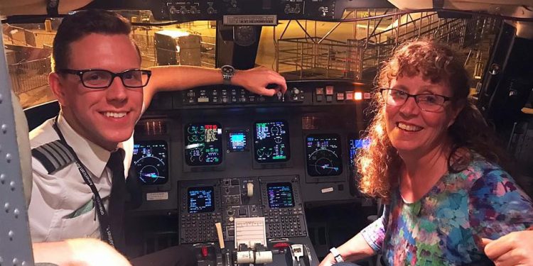 Anne-oğul, uçuş sonunda kokpitte hatıra fotoğrafı çektirdi.