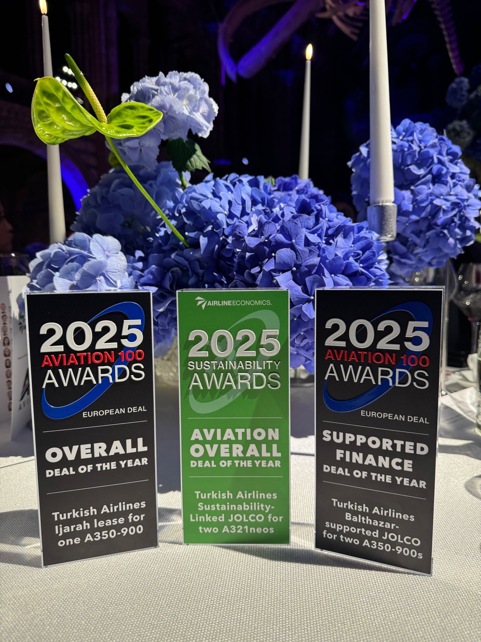 Ayrıca, sürdürülebilirlik vizyonunu finansman yapılarıyla birleştiren Türk Hava Yolları, 2024 yılında iki adet Airbus A321 Neo uçağının Societe Generale konsorsiyumu tarafından Euro ve Japon Yeni döviz cinsinden Sürdürülebilirlik bağlantılı JOLCO finansmanı işlemiyle “Yılın Sürdürülebilir Havacılık Finansmanı” ödülüne layık görüldü.