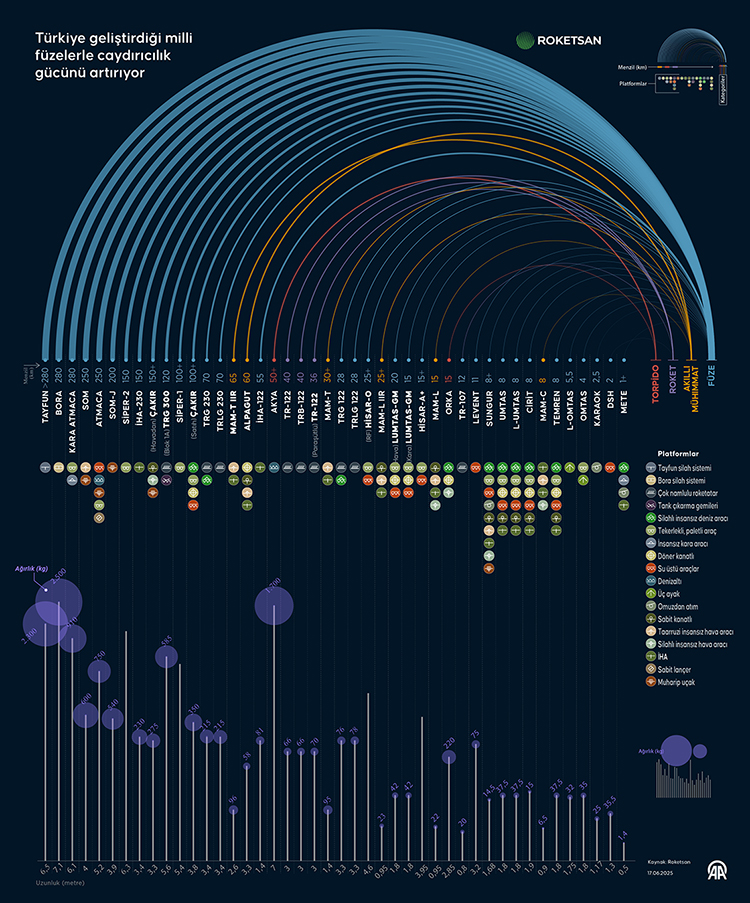 AA muhabirinin derlediği bilgilere göre, Savunma Sanayii Başkanlığının (SSB) destekleriyle ROKETSAN tarafından üretilen milli füzeler, Türkiye’nin savunmasında önemli rol oynuyor. Bu füzeler arasında öne çıkan kara sistemlerinden TAYFUN füzesi 280+ kilometre menzille görev yapıyor. TAYFUN, hipersonik seviyelere ulaşan hızı sayesinde hava savunma sistemi tehditlerinden etkilenmiyor. Füze, düşük çevre koşulu duyarlılığı sayesinde gece ve gündüz olmak üzere her hava koşulunda görev yapabiliyor.