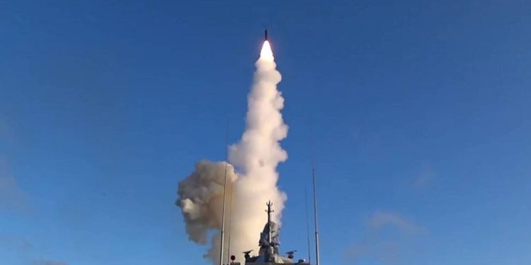 Rusya Savunma Bakanlığı tarafından, geminin burnundaki üst güvertede bulunan açık fırlatma konteynerinden fırlatılan, havada manevra yapan ve hedefe giden füzenin görüntüsü yayınlandı.