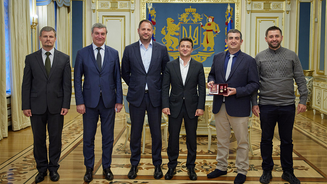 Ukrayna Devlet Başkanı Vladimir Zelenskiy, Baykar Genel Müdürü Haluk Bayraktar’a Kiev’deki Devlet Başkanlığı sarayında Devlet Nişanı verdi.
