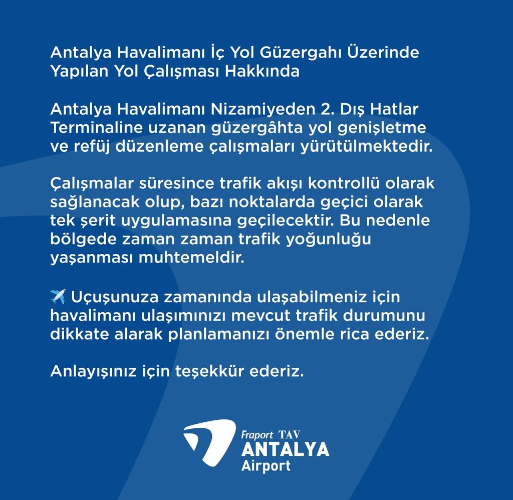 Antalya Havalimanı iç yolundaki çalışmalar nedeniyle bazı noktalarda tek şerit uygulanacak, yolcuların erken yola çıkmaları istendi.