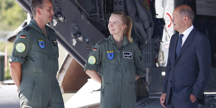 Daha sonra, fuar alanını gezen Scholz, Lockheed Martin tarafından üretilen F-35 savaş uçağının sergi alanında yetkililerden bilgi aldı.