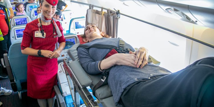 Hastalığı nedeniyle uzun süre oturarak seyahat etmesi mümkün olmayan Gelgi için THY yetkilileri uçakta 6 koltuğu sedye haline getirdi.