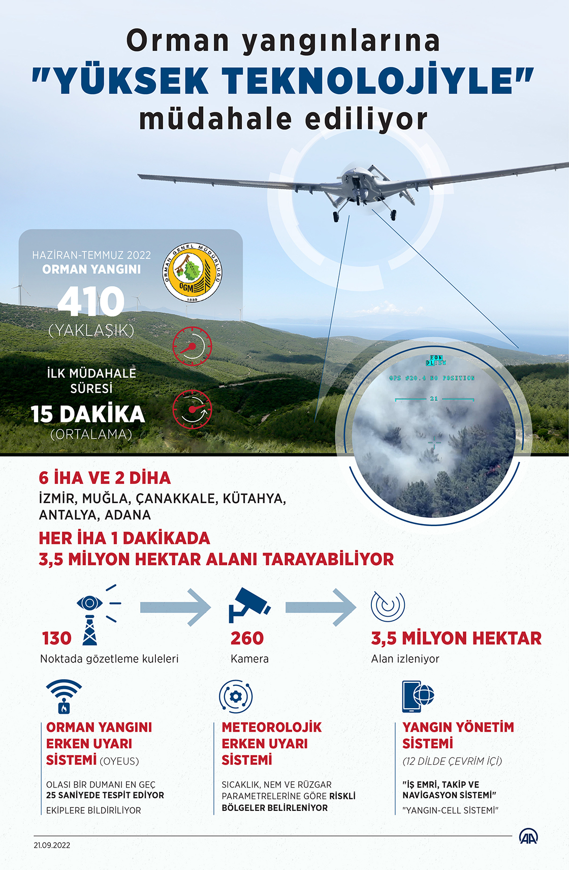 Orman Genel Müdürlüğü (OGM), kullandığı yeni teknolojilerle alevlere müdahale süresini azaltırken hem yangın söndürme çalışmalarının sevk ve idaresinde etkinliğini artırıyor hem de iş gücü kayıplarının önüne geçiyor. Kullanılan insansız hava araçları (İHA) yangınlara müdahale süresini kısalttı.
