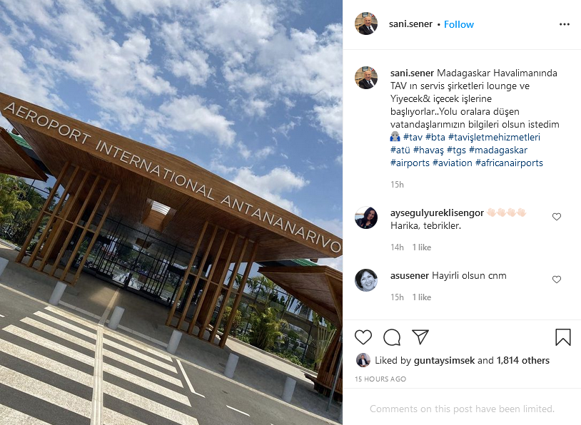 TAV Havalimanları CEO’su Sanai Şener, Madagaskar Antananarivo Ivato Havalimanı’nda hizmet vermeye başlayacaklarını açıkladı. Şener’i,n sosyal medya hesabından yaptığı paylaşımda, “Madagaskar Havalimanı’nda TAV’ın servis şirketleri lounge ve yiyecek&içecek işlerine başlıyorlar. Yolu oralara düşen vatandaşlarımızın bilgileri olsun istedim” ifadelerine yer verdi.
