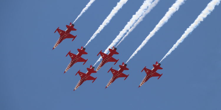 Türk Hava Kuvvetleri’nin akrobasi timi Türk Yıldızları, Sakarya semalarında selamlama uçuşu gerçekleştirdi.