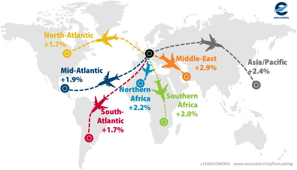 Raporda 2050 yılında Avrupa-Ortadoğu uçuşlarının yüzde 2.9 artmasıyla Ortadoğu’nun en yoğun akışa sahip bölge haline geleceği bildirildi. Asya-Pasifik yüzde 2,4, Kuzey Afrika yüzde 2,2, Güney Afrika yüzde 2, Orta Amerika yüzde 1,9, Kuzey ve Güney Amerika uçuşları ise yüzde1,7 yükselecek.