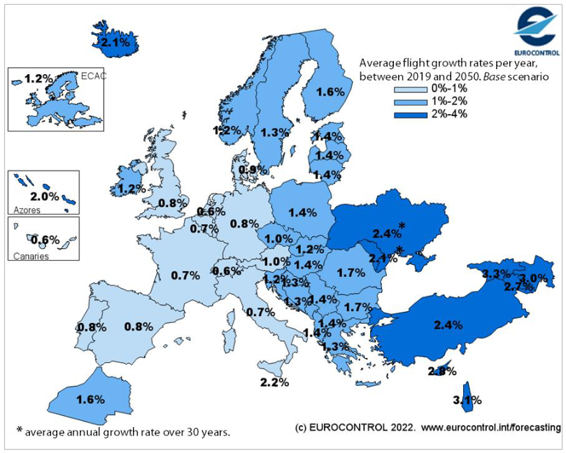Eurocontrol tarafından yayınlanan “Havacılık Görünümü 2050” raporunda 2050 yılı beklentilerine dair kapsamlı değerlendirmelere yer verildi. Buna göre, 2019’da 11,1 milyon olan yıllık uçuş sayısı temel senaryoya göre 2020 yılında yüzde 44 artışla 16 milyona ulaşacak. Yüksek senaryoya göre uçuş sayısı 19,6 milyona, düşük senaryoya göre ise 13,2 milyona ulaşacak.