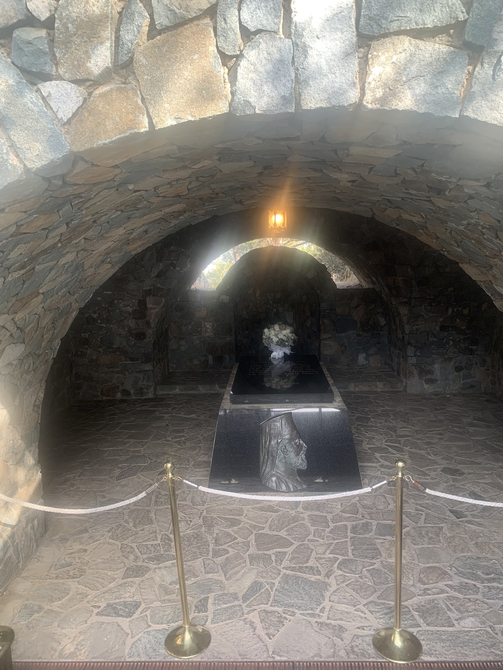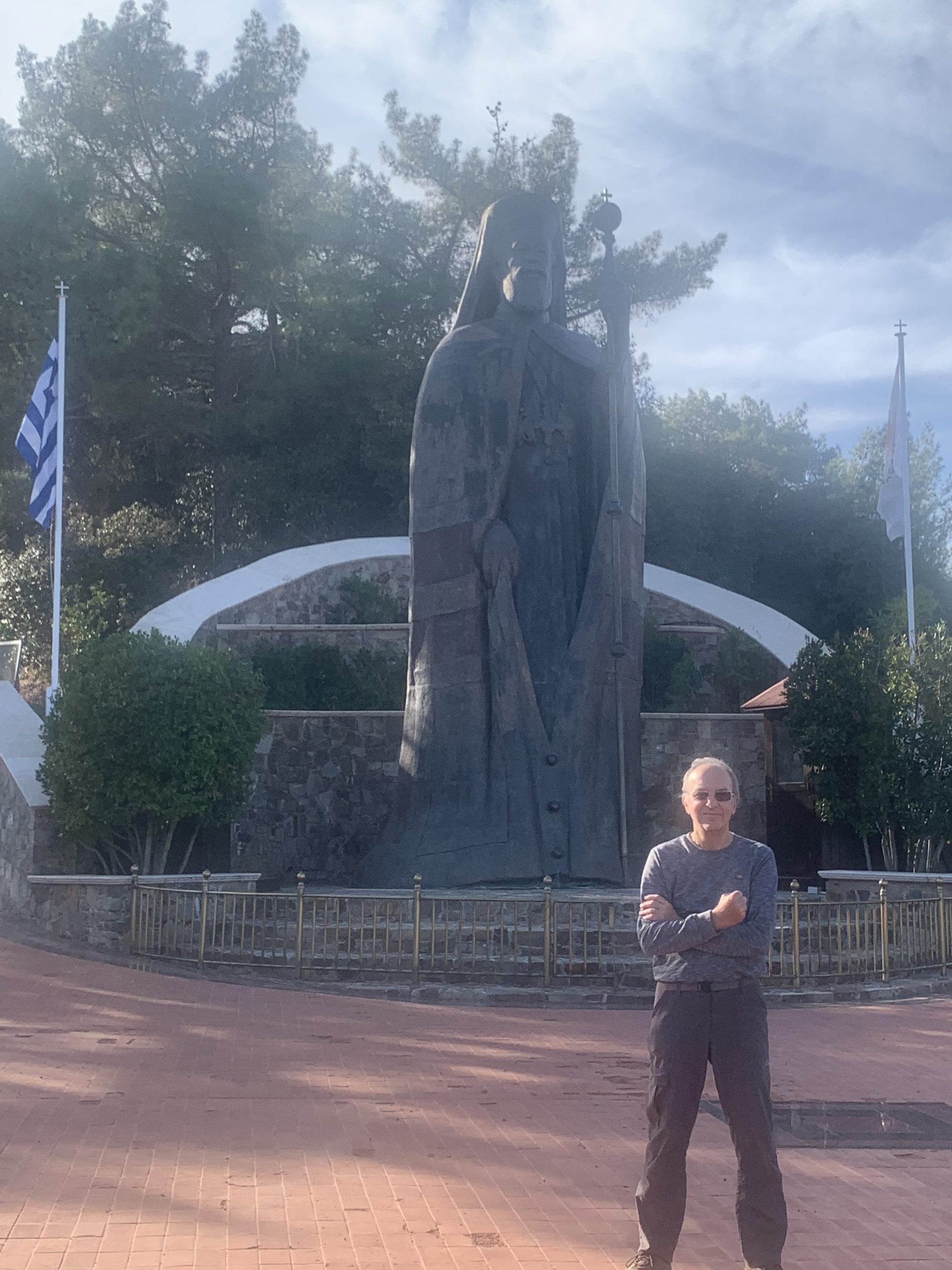 Arabamızdan indiğimizde karşımızda Makarios’un dev bir heykeli duruyordu. O an zamanında Gürcistan’da Stalin’in köyünde kendisinin büyük bir heykeli önünde fotoğraf çektirdiğimi hatırladım ve burada da hemen bir fotoğraf çektirdim. Daha sonra yaya olarak dağın zirvesine doğru yürümeye başladık. Zirveye çok yakın bir yerde Makarios’un mezarını gördük. Onu da fotoğraflayıp aracımıza geri döndük.