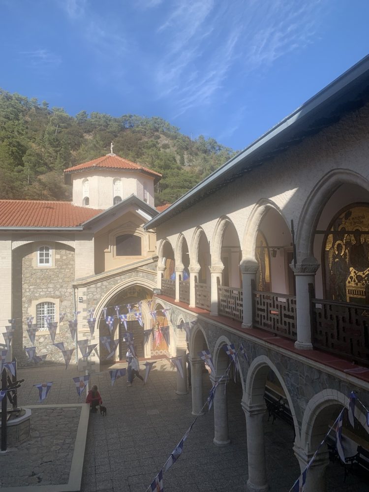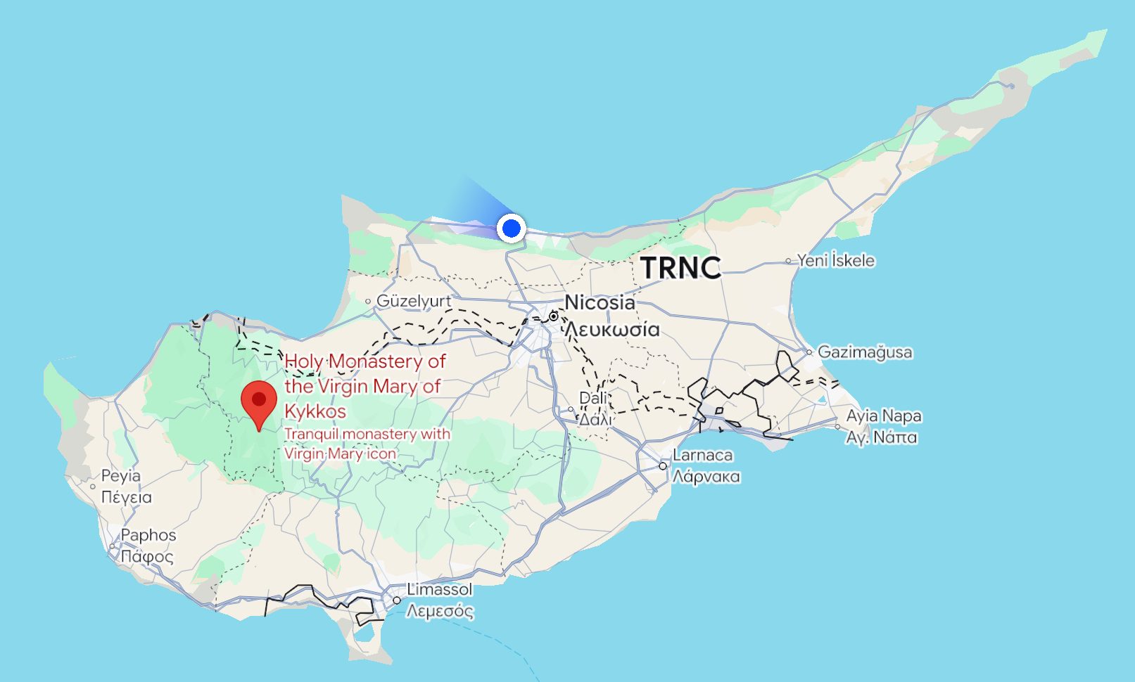 23 Kasım 2025 Pazar günü bir arkadaşımızın şoförlüğü ve rehberliğinde Güney Kıbrıs’a geçtik. Yolculuğumuz Lefkoşa’da başladı. Rahat bir yolculukla önce Güzelyurt’a ulaştık. Güzelyurt’ta anayoldan ayrılıp güneye doğru bir süre yol aldık ve Aşağı ve Yukarı Bostancı’nın içinden geçip sınıra ulaştık. Sınırın hemen diğer tarafında olan Astromeritis köyünden geçip Yeşil Hat’ta hemen hemen paralel uzanan bir yoldan batıya doğru ilerlemeye devam ettik. Bir süre sonra Trodos’un rampalarına tırmanmaya başlamıştık. Yola çıktıktan bir buçuk saat kadar sonra Kykkos Manastırı’na ulaştık. Yüksek bir tepenin doğu yamacında olan bu manastıra Türkler de Cikko adını vermişler. Buraya ulaşmak için epey virajlı bir yolu aşmak gerekiyor. Manastır denizden 1318 metre yüksekte bir yere kurulmuş.