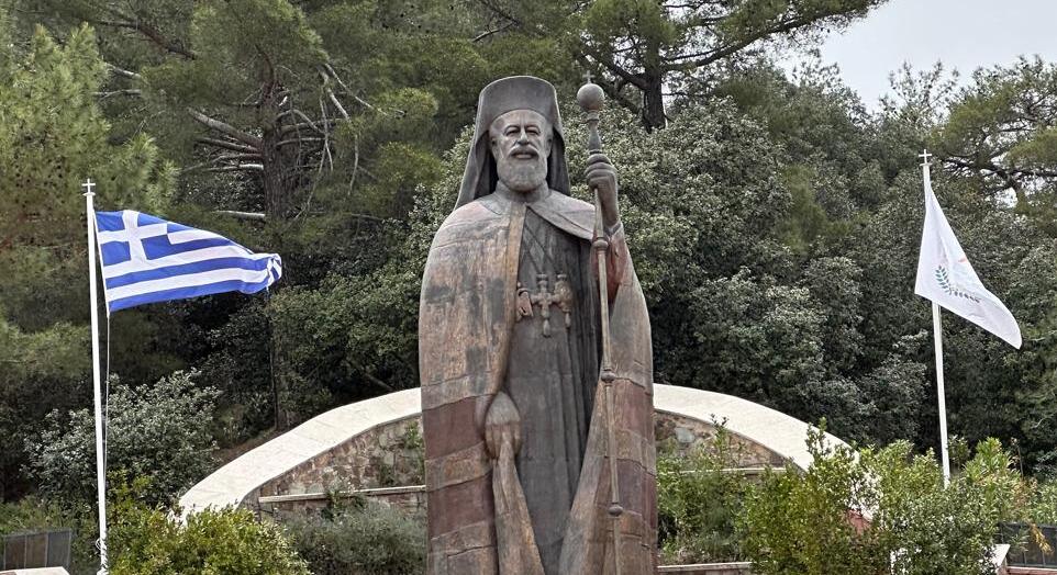 Arabamızdan indiğimizde karşımızda Makarios’un dev bir heykeli duruyordu. O an zamanında Gürcistan’da Stalin’in köyünde kendisinin büyük bir heykeli önünde fotoğraf çektirdiğimi hatırladım ve burada da hemen bir fotoğraf çektirdim. Daha sonra yaya olarak dağın zirvesine doğru yürümeye başladık. Zirveye çok yakın bir yerde Makarios’un mezarını gördük. Onu da fotoğraflayıp aracımıza geri döndük.