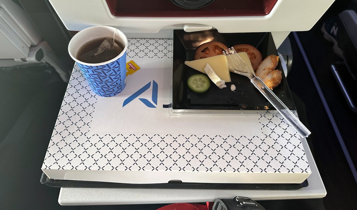 İkram kutusu, yemek tepsisinin boyutuyla hemen hemen aynı. Yemeğinizi alıp sıra içeceğinize geldiğinde onu nereye koyacağınız kara kara düşündürüyor. İçecek bardağınızı yandaki yolcunun yemek tepsisine koyamayacağınız için mecburen kutunun üzerinde tutuyorsunuz. Sonrasında bardağı kaldırıp yiyeceğiniz ikramları yine kutunun üzerine koyup tüketmeniz gerekiyor.