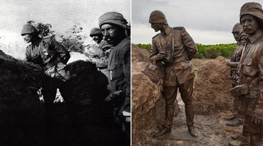 Türkiye Cumhuriyeti’nin Kurucusu Büyük Önder Gazi Mustafa Kemal Atatürk’ün Çanakkale Muharebeleri’nde Conkbayırı civarındaki bir siperde, arkasında 3 askerle düşmanı gözetlerken çekilen fotoğrafı, heykel haline getirilerek ziyarete açıldı.