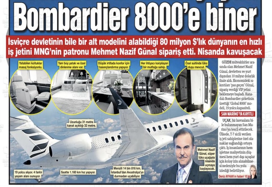 MNG patronu Günal’ın önce Global 7500 model iş jeti için sipariş verdiğini, daha sonra bu kararını bir üst model olan Global 8000’e dönüştürdüğüne haberde yer vererek, “MNG Jet San Marino’lu olacak” vurgusu yapmıştık.