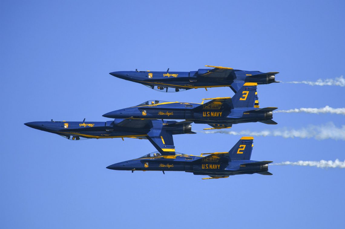 ABD Donanma’sının gösteri takımıdır. Dünyanın en eski 2. hava akrobasi takımı olma özelliği taşır. 1946’da kurulan Blue Angels, 8 adet Mc Donnell Douglas F/A18 Hornet tipi uçaktan oluşur. Amiral Chester Nimitz tarafından 3 adet Grumman F6F-5 Hellcats tipi uçakla kuruldu. Her yıl 11 milyon seyircinin izlediği takım, bugüne kadar 260 milyondan fazla kişi için gösteri yaptı. Gösteri sezonu her yıl mayıstan kasıma kadar sürer. 6 uçakla gösteri yapan takımın; 1-2-3-4- numaralı uçakları “elmas”, 5-6 numaralar ise “solo” olarak uçuşlarını yapar. Elmas uçuşları; genelde solo uçuşlarını destekleyen, gösteriler arasındaki geçişleri sağlayan ve halkı selamlama uçuşlarıdır. Solo uçuşlar ise yüksek hızlı geçişler, hızlı manevralar ve dar dönüşlerle gösteriye heyecan katan uçuşlardır. Blue Angels’ın kullandığı McDonnell Douglas F/A-18 Hornet iki motorlu bir savaş uçağıdır. General Electric F404 turbofan motorları mevcut.