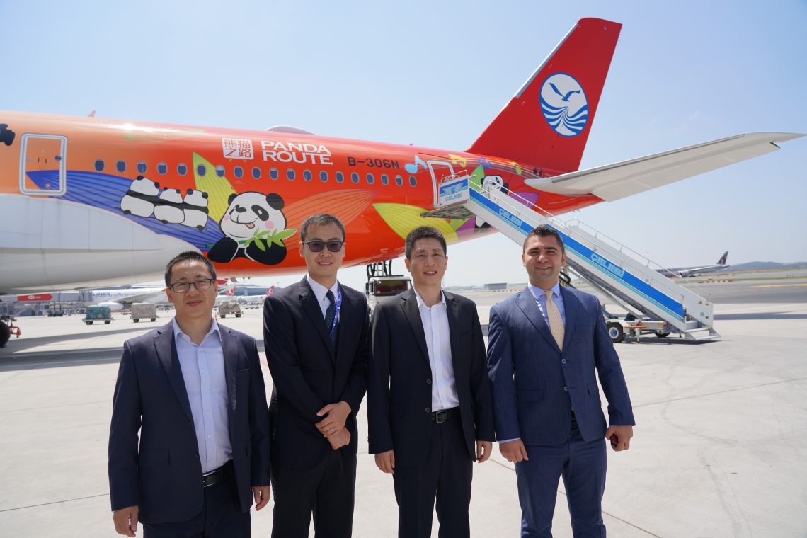 151 uçağı bulunan Sichuan Airlines’ın filosuna Nisan ayında katılan panda resim giydirilmiş A350 model uçağı İstanbul Havalimanı’na indi. Uçağı İstanbul havalimanında karşılayanlar arasında Çin’in büyükelçisi de bulunuyordu.
