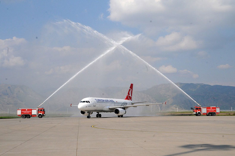 Türk Hava Yolları’nın (THY) İstanbul Havalimanı’ndan ilk tarifeli seferini yapan uçak, Şırnak Şerafettin Elçi Havalimanı’nda su takıyla karşılandı.