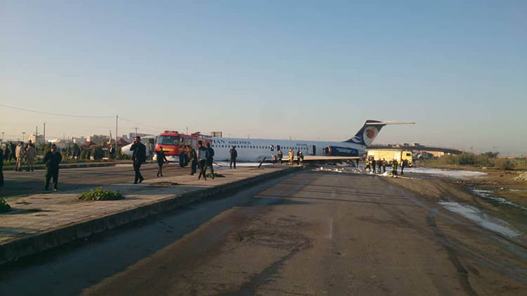 Başkent Tahran’dan havalanan Caspian Airlines’a ait 1994 yılı üretimi MD-83 tipi yolcu uçağının Mahşehr Havalimanı’na inişinde pistten çıktığı bildirildi.