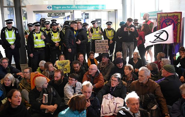 Londra Şehir Havalimanın’nda (London City Airport) küresel ısınma ve iklim değişikliklerinden kaynaklanan çevre felaketlerine dikkati çekmek isteyen çevreciler gösteri düzenliyor.