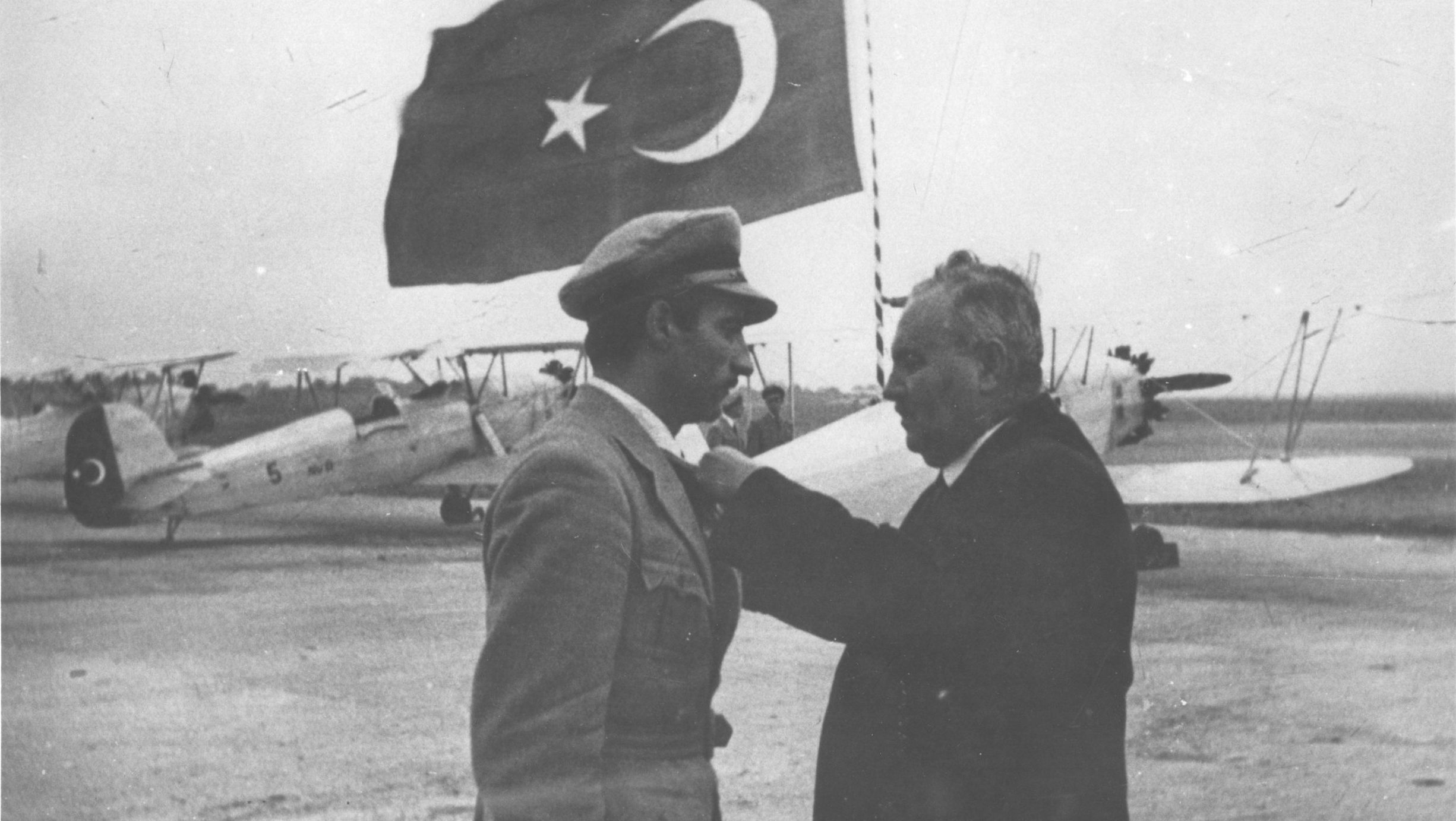 Nuri Demirağ pilotlarına rozet/bröve takıyor.