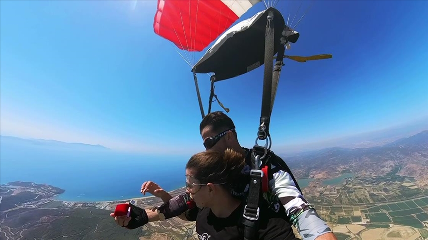 İzmir’in Selçuk ilçesinde serbest paraşüt eğitmeni Mehmet Karadaş, kız arkadaşı Aybike Aşkar’a paraşüt atlayışı sırasında evlilik teklif etti.