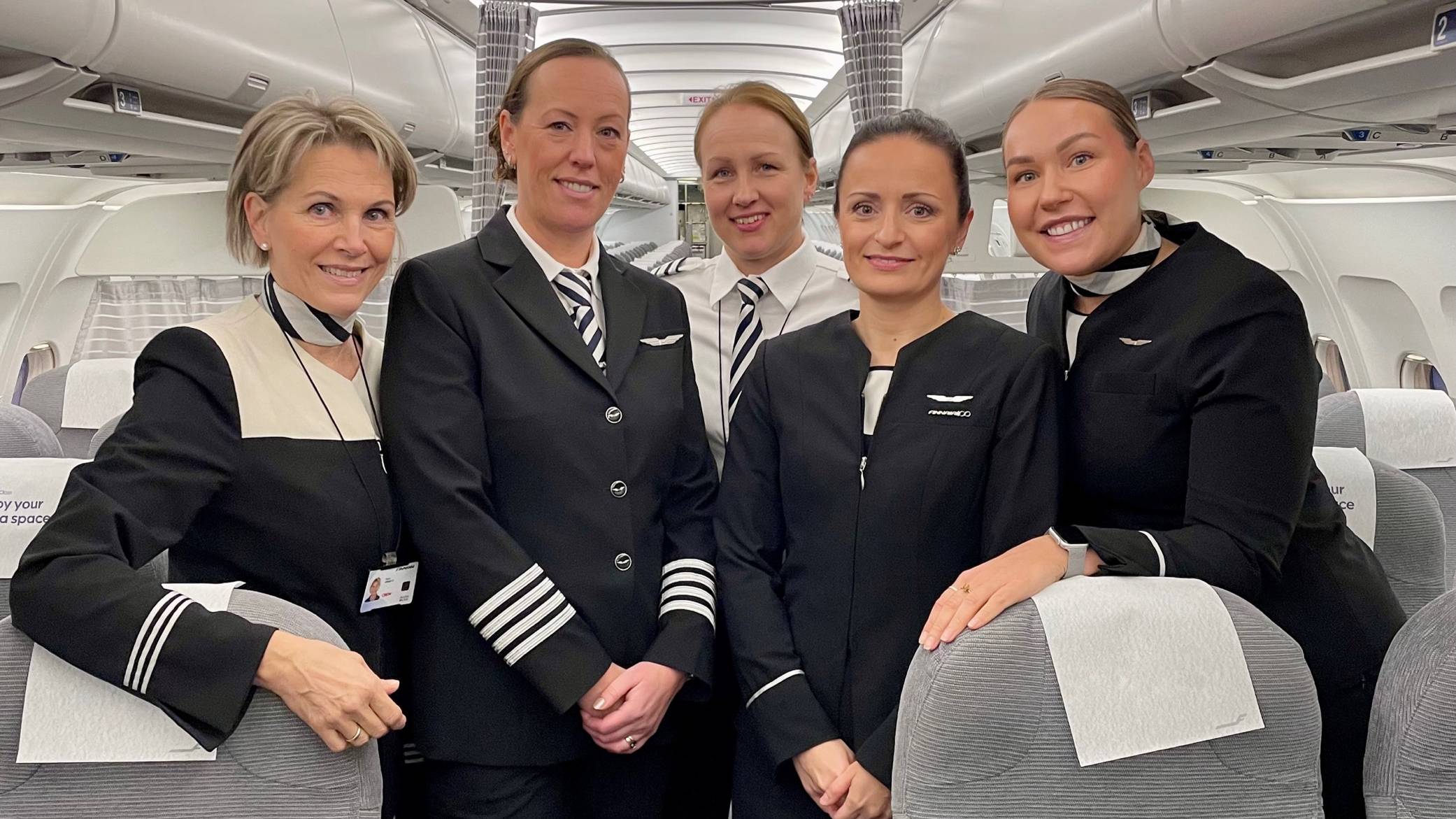 Finnair A320 model uçakta görevli memurların isimlerinin Tuija, Johanna, Sanna, Miia, Veera olduğu sosyal medyadan paylaşıldı. Havayolu şu şirket çalışanlarının yüzde 56 seviyelerinde olduğunu, gelecekte pilot ve teknik ekip olarak daha çok kadınla çalışmayı istediklerini belirtti.