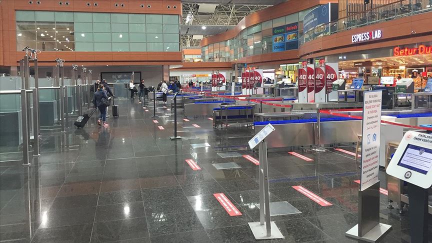 İstanbul Uluslararası Sabiha Gökçen Havalimanı terminalinde yeni tip koronavirüs önlemleri kapsamında yolcular arasında mesafe oluşturmak için kırmızı bant uygulaması başlatıldı.