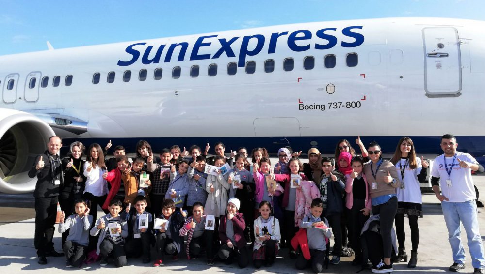SunExpress uçağını ve kokpitini yakından görme ve inceleme imkânına sahip olan öğrencilere SunExpress ekibi tarafından kitaplar hediye edildi.