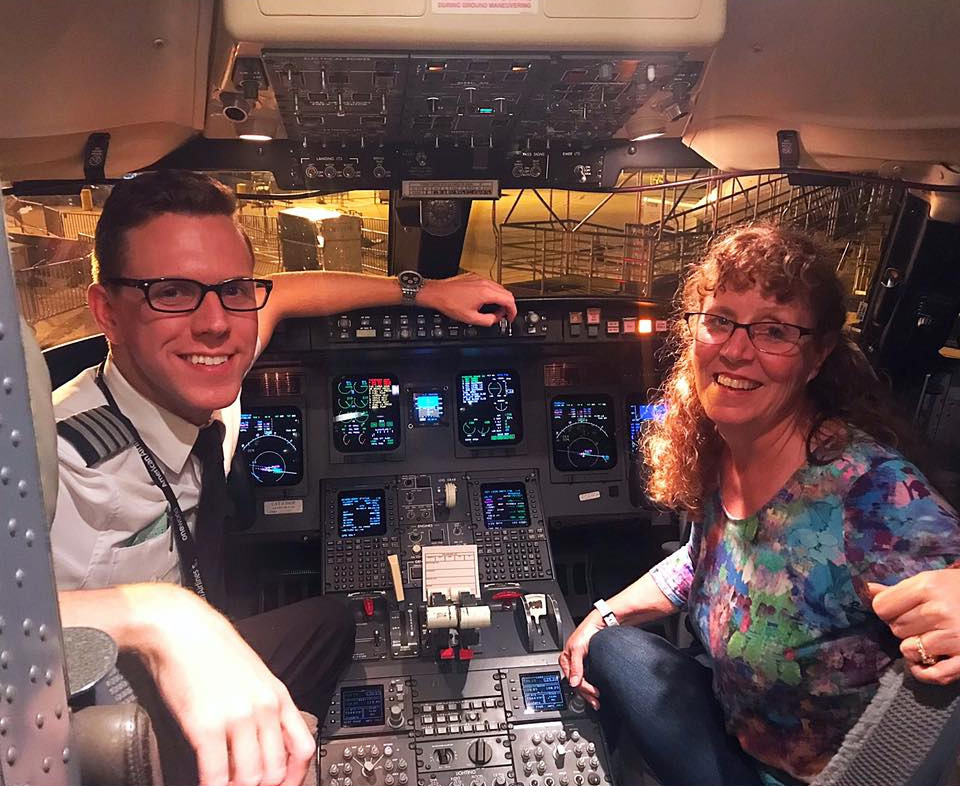 Anne-oğul, uçuş sonunda kokpitte hatıra fotoğrafı çektirdi.