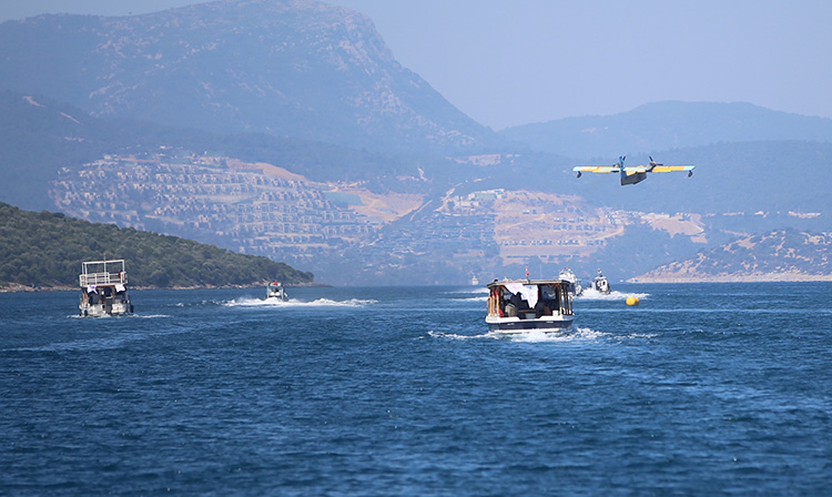 Muğla’da orman yangınlarına karşı hazır bekletilen Türk Hava Kurumuna (THK) ait iki CL-215 amfibik yangın söndürme uçağı, Bodrum açıklarında test uçuşu yaptı.