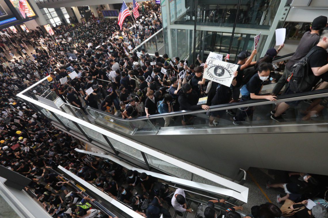 Binlerce Hong Konglu, protestolara polis müdahalesinin sertleşmesine tepki olarak sabah saatlerinde havalimanının ana terminalini, geliş ve gidiş salonlarını işgal etmişti. Göstericilerin sayısının giderek artması, yolcuların check-in ve varış işlemlerini tamamlamasını yavaşlattı.