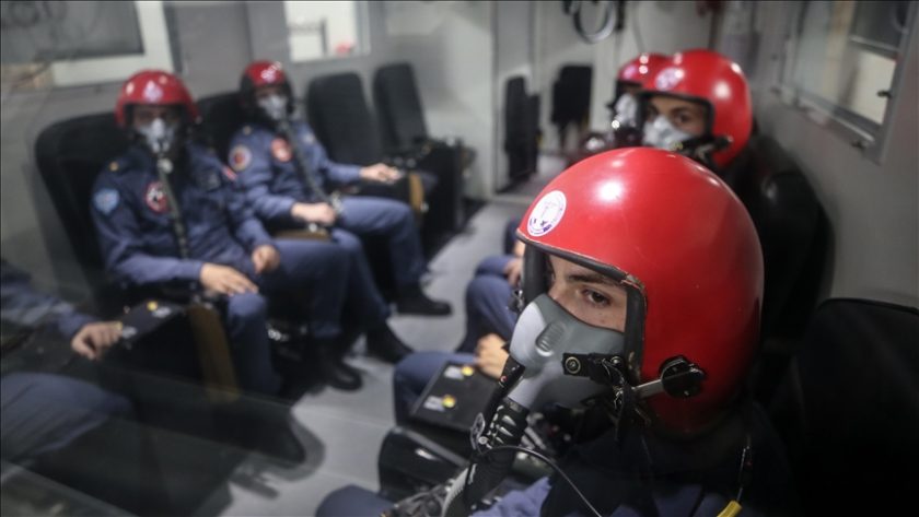 USAEM’de akademik eğitim verilen adaylara, alçak basınç odasında 25 bin fit irtifa basıncı ve G kuvvetine (ani hız değişimleri ve manevralar sırasında pilotların maruz kaldığı kuvvet) dayanıklılık seviyelerinin ölçüldüğü insan santrifüj (dairesel dönme hareketi gerçekleştiren makine) laboratuvarında (G-Lab) testler uygulandı.