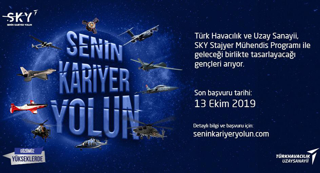 Türk Havacılık ve Uzay Sanayii, ülkemizin savunma sanayiinde dışa bağımlılığını azaltma hamlelerine doğrudan katkı sağlamaya devam ediyor. Milli projelere yakından tanıklık etme olanağı sunan ve TUSAŞ bünyesinde kurulan SKY (Senin Kariyer Yolun) stajyer mühendis programının başvuruları açıldı. Başvurular, 5 Ağustos – 13 Ekim 2019 tarihleri arasında yapılabilecek.