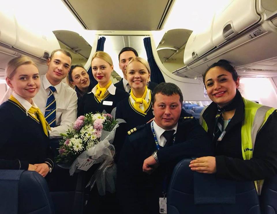 Ukrayna Havayolları’nın 213 yolcusuyla Kiev’den gelen ilk seferinde kabin ekibi çiçeklerle karşılandı.
