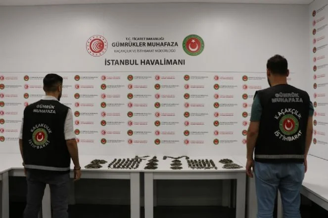 İstanbul Havalimanı’nda yurt dışına çıkarılmak istenilen 4 bin sikke ile 27 tarihi eser niteliğindeki objeye el konuldu.