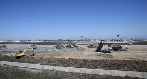 Atatürk Havalimanı yerleşkesinde geniş bir alanda oluşturulan inşaat sahasında iş makineleri ve hafriyat kamyonları ile hummalı bir çalışma yürütülüyor.