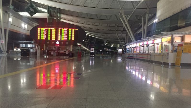 Bilet satış noktalarının kapalı olduğu havalimanında, görevli personel dışında kimsenin olmadığı görüldü.