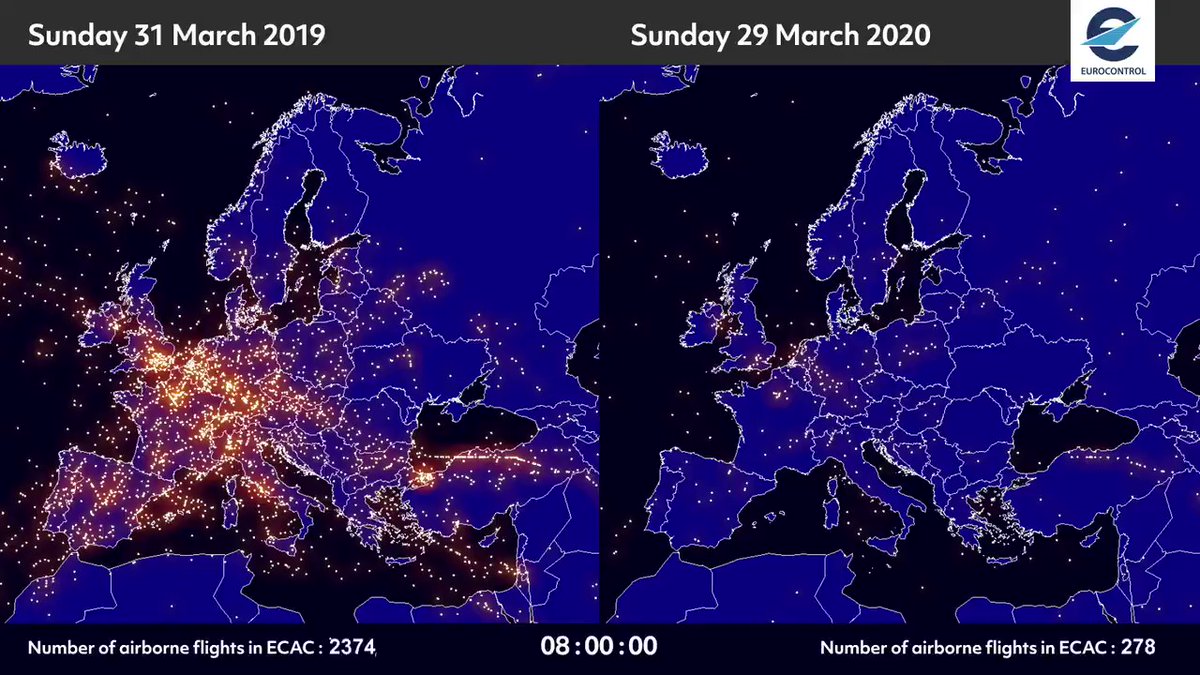 #COVID19 – snapshot of what the traffic looked like this Sunday, 29 March, compared to Sunday 31 March 2019 across the @eurocontrol area. @Transport_EU @IATA @A4Europe @ECACceac @ACI_EUROPE @CANSOEurope @eraaorg pic.twitter.com/jctm4JN6R4
