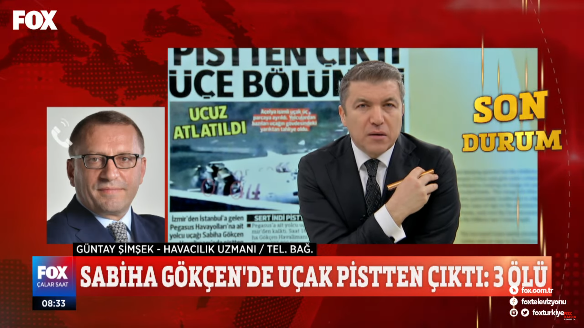 Pegasus Hava Yolları’na ait Boeing 737-800 tipi uçağı Sabiha Gökçen Havalimanı’na inişi sırasında duramayarak pistten çıkmıştı. Kaza sonrasında 180 kişi hastaneye kaldırıldı, 3 yolcu ise hayatını kaybetmişti. Habertürk köşe yazarı ve Airport programı yapımcısı Güntay Şimşek konuyla alakalı Fox Tv’nin sunucusu İsmail Küçükkaya’nın sorularını yanıtladı.