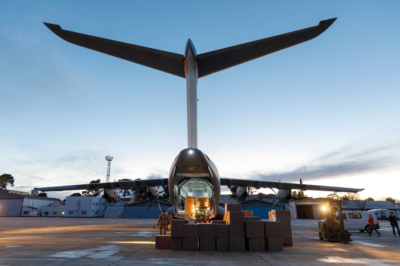 Bir Airbus A400M nakliye uçağı, İspanyol sağlık hizmetlerinde kritik öneme sahip maske ihtiyacını gidermek amacı ile Toulouse ve Madrid arasında bir hava köprüsü kurdu.